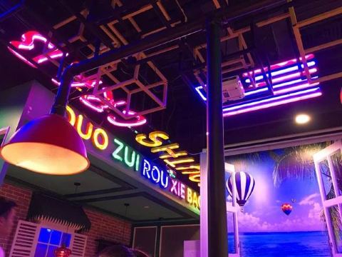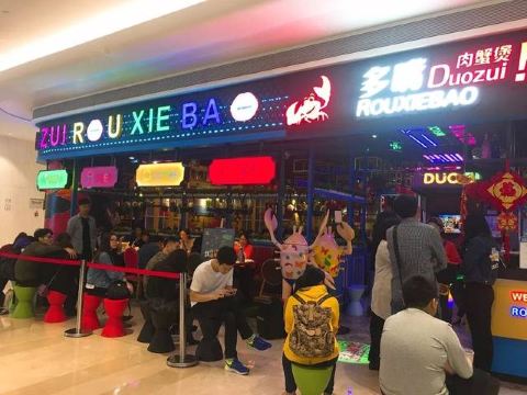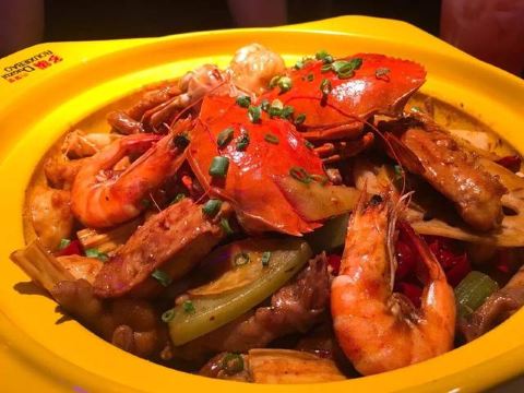 Duo Zui Crab Pot网红店的感觉,排队人是真多,不过这家肉蟹煲味道真的很不错,全家福、肉蟹煲、明虾煲、鸡翅煲、排骨煲……等各种,每次都点全家福,包括螃蟹、虾、鸡中翅,还有鸡爪、年糕、莲藕、腐竹、土豆、玉米、鱼丸等,配菜特别丰富,酱汁特别入味,两个人吃一锅超满足,不用点其它的凉菜烧烤那些也能吃得饱饱的。多嘴肉蟹煲不仅“实力”杠杠的,“颜值”也很高,很喜欢这种文艺范儿的装修,不管是情侣、闺蜜还是家人都挺适合这种环境。