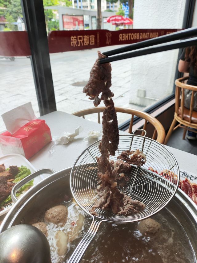 到潮州出差,来这里吃过好几回了,感觉店面比较大,比较宽敞明亮,伙计们服务还都挺热心的。有些细节吧,还需改进一下,比如说,撇沫子先摆个容器在桌子上。 既散点过,也点过团购套餐,感觉着散点的肉品比团购的要好些。团购的肉品,好像牛肉要么放了比较长的时间,要么部位不是太好,而且刀工很随意,很多牛肉都不成片,涮起来一大坨。 个人比较喜欢吃三花趾、五花趾、嫩肉,比较瘦,火锅里涮几秒,蘸上灵魂沙茶酱,鲜嫩可口。 到了潮汕就要试一下牛肉火锅,可以来此一试。