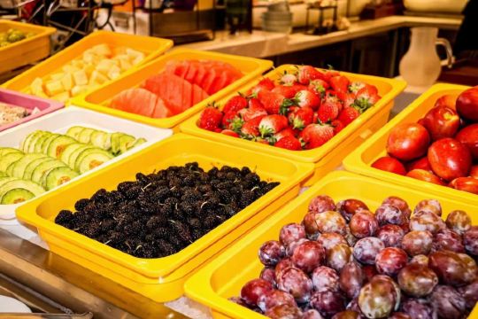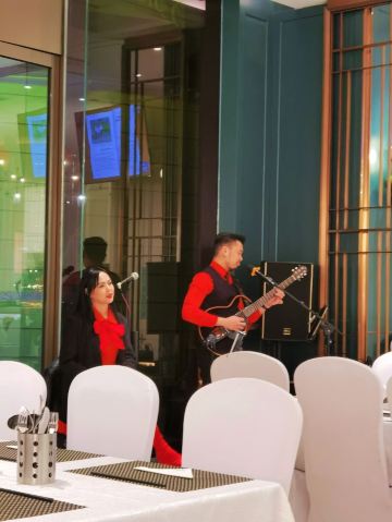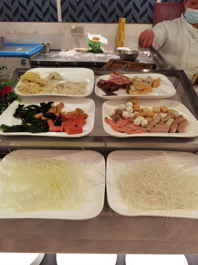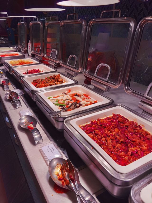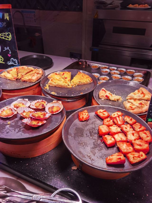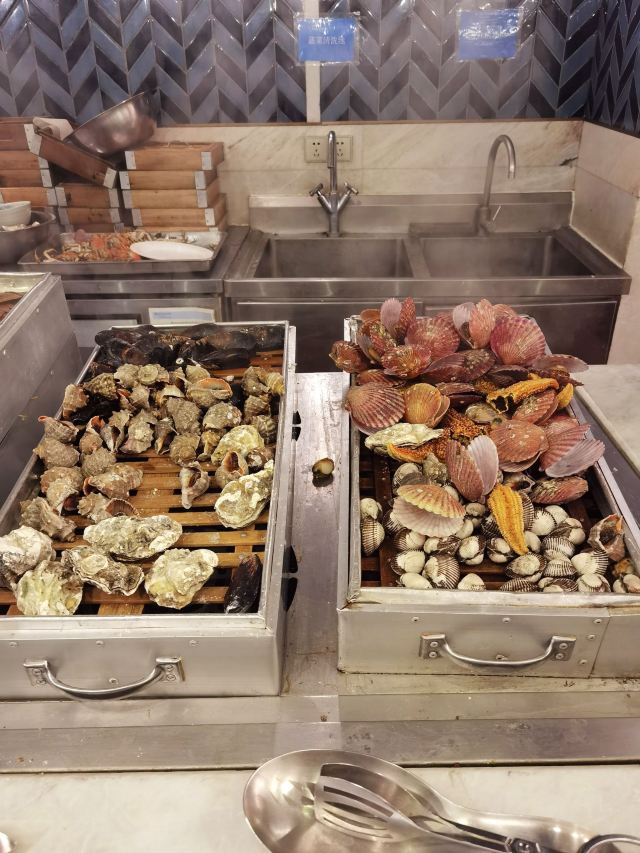 青青岛-有时候酒店内的自助餐并不是因为特别喜欢才吃的,也可以是为了方便或者不知道吃啥的时候选择自助最好。鑫江温德姆酒店内的自助餐和早餐是一个地方,大堂一楼的一个角落,不仔细找很容易错过。面积还可以,可以容纳不少人,餐饮分熟食凉菜火锅区域。炒菜肉类等都有,味道一般,还有一些麻辣串串什么的,最赞的就是蒸海鲜了。扇贝非常的大,海虹非常鲜,关键是虾肉质弹而且带着一丝甜味,说明非常的新鲜,旁边给配制的姜醋。自助可以忽略到面点,披萨等碳水化合物,但是海参包子可以浅唱。另外,餐厅的一角有驻唱,东南亚歌手,都是一些轻音乐和歌曲,优雅而不吵闹。住宿配的自助,性价比还是不错的,儿童单独88元一位。