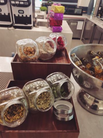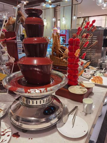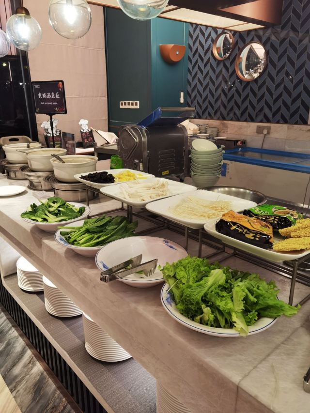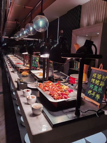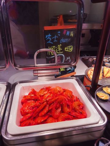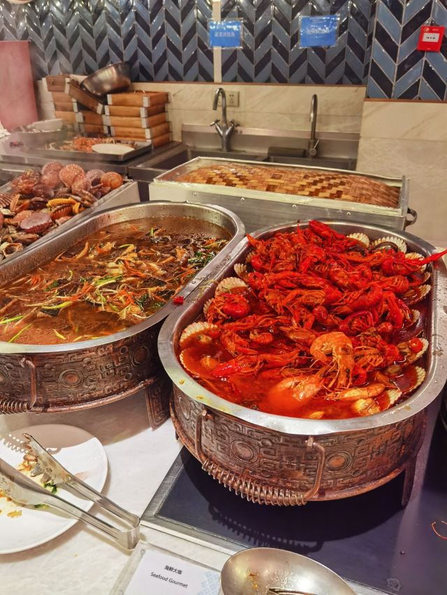 Xinjiangwendemushuiqingkafeiyuan有时候酒店内的自助餐并不是因为特别喜欢才吃的,也可以是为了方便或者不知道吃啥的时候选择自助最好。鑫江温德姆酒店内的自助餐和早餐是一个地方,大堂一楼的一个角落,不仔细找很容易错过。面积还可以,可以容纳不少人,餐饮分熟食凉菜火锅区域。炒菜肉类等都有,味道一般,还有一些麻辣串串什么的,最赞的就是蒸海鲜了。扇贝非常的大,海虹非常鲜,关键是虾肉质弹而且带着一丝甜味,说明非常的新鲜,旁边给配制的姜醋。自助可以忽略到面点,披萨等碳水化合物,但是海参包子可以浅唱。另外,餐厅的一角有驻唱,东南亚歌手,都是一些轻音乐和歌曲,优雅而不吵闹。住宿配的自助,性价比还是不错的,儿童单独88元一位。