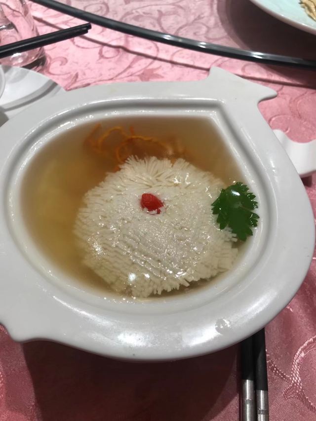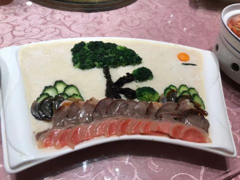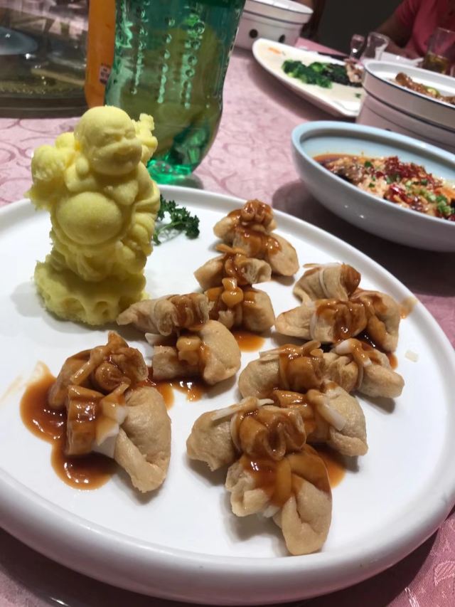 淮上豆府有很多连锁 从名字就可以看出这家店主打豆腐,于是我们点了招牌鱼头豆腐煲、炸豆腐排、淮府黄金牛肉,另加了一份烫菜蔬菜拼盘。豆皮蝴蝶馓系用千张包裹馓子和葱根小菜,馓子一咬嘎嘣脆,混合着酱料菜汁,简直了!还是很有特色的