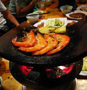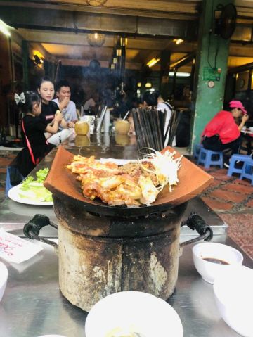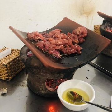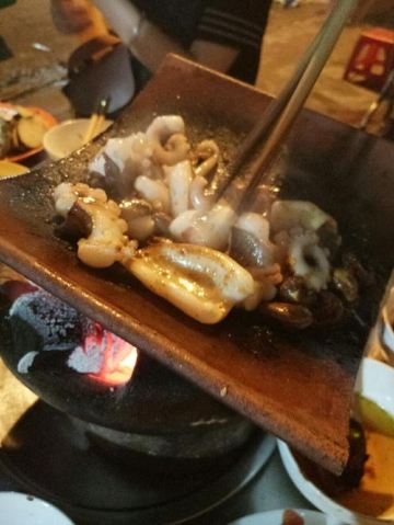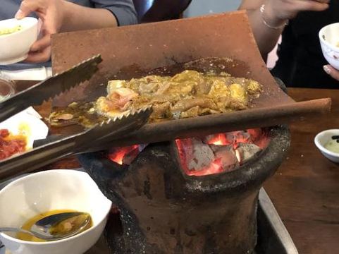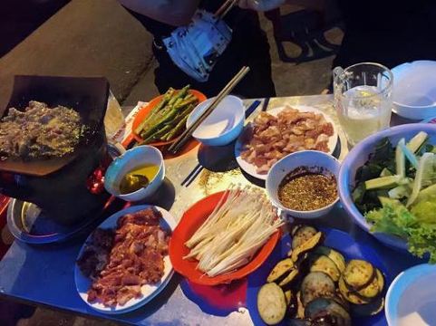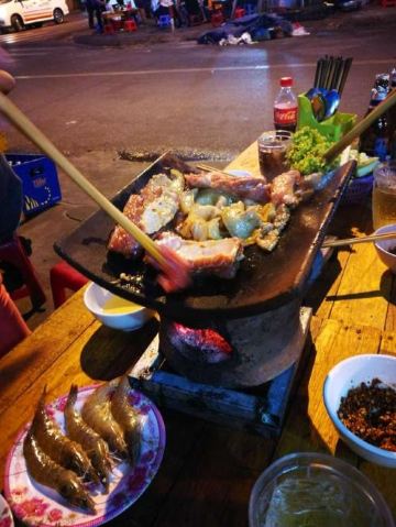这个地方的瓦片烤肉是芽庄最早的瓦片烤肉,其他几家都是模仿,老板中国人,人很不错,招呼我们上二楼。把菜放到瓦片上烤,蘸水比较像酱油。我是觉得挺好吃的,不过朋友不太喜欢。