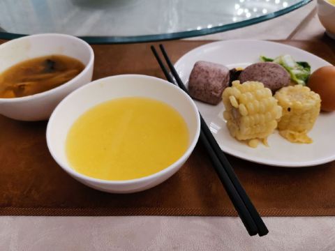 周口饭店餐厅在周口饭店的一楼,里面有包厢,也有堂吃,早上是酒店的自助餐,东西蛮多的,但是都是素的,中饭和晚饭可以点菜,菜量非常大,我们两个人点了三个菜,就吃的很饱。
