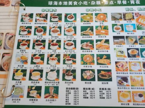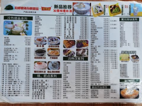芒果肠粉,清补凉,腌粉,椰子冻,红豆椰奶糕,煎菜包,赤糖甜薯甩,芒果绵绵冰,咸玉米烙,酸粉,黄金南瓜饼,椰奶山芋,野菜包,脆皮南瓜卷,炒饭,什锦南瓜露,什锦粗粮,冰生姜立顿,冰茉莉花,冰菊花朵,冰黑豆鲜奶,十谷杂粮粥,压草豆地瓜干汤,脆皮高粱卷,和树腌粉,榴莲绵绵冰,香煎菜包,椰奶鸡屎藤,盐焗鸽,玉米烙饼,盐焗鸡,特色清补凉,玉米捞,杂粮炒面,椰汁清补凉