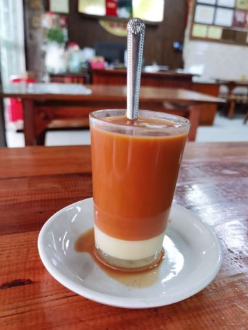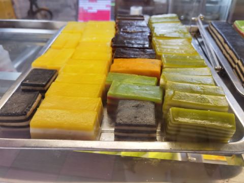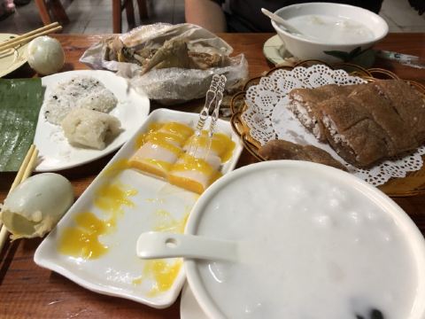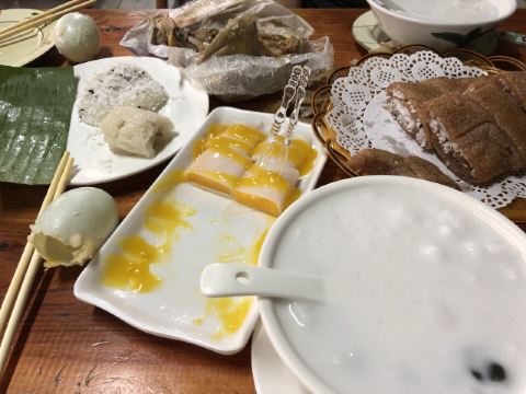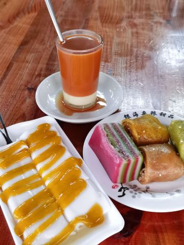 《晓世界》国内篇📍海南 在琼海,杂粮文化好像挺深入人心的,甚至专门命名了一条杂粮街,主打此类小吃。整条街上少说也有十几家店吧,但不是每一家三餐都营业,这家看起来是营业时间最长的之一,排名也还不错,东西也比较全,就选它了。 [服务铃]服务: 有些服务员阿姨的普通话一般,所以交流起来,不是特别的顺畅,但是服务还是很耐心和热情的,看我要点杂粮拼盘,还特意提醒目前种类不太全,并且其实可以分开单点。 |杂粮卷饼盘(中份)^因为到的比较早,只有三种做好的杂粮卷,在服务员的提醒下单独点了每种一块尝一尝,外皮分不同的口味,内里的馅料好像是差不多的,里面的姜味对我来说略有点重。 |芒果肠粉^也是网上琼海的特色菜之一,是从冰箱里拿出来凉的,芒果很大一颗,外皮也很滑嫩,味道还是很不错的,天气热的时候吃应该更美味。 |瘦肉粉汤^冬日寒潮下的琼海,其实早上还挺冷的,这时候喝上一碗暖暖的粉汤,胃里还是很舒服的,味道还不错,价格也很便宜,才不到十块钱。 |麦奶茶^点的热奶茶,账单上写的麦奶茶,不知道是不是同一种,这家的茶味蛮浓的,在调开杯底的炼乳之前,单喝一口上面的茶真的很苦,不过调开以后甜度就很高啦,比较浓郁,好喝。 店里还有很多很多的甜品小吃,特别是凉的,看起来很诱人,可惜天气实在太冷了,只能以后有机会再尝试了。