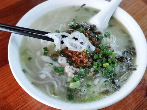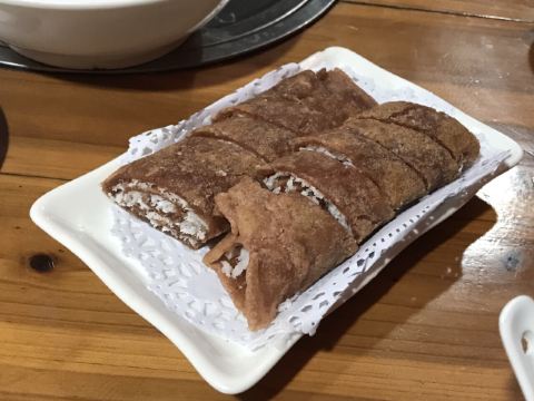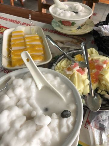 Helen晓世界《晓世界》国内篇📍海南 在琼海,杂粮文化好像挺深入人心的,甚至专门命名了一条杂粮街,主打此类小吃。整条街上少说也有十几家店吧,但不是每一家三餐都营业,这家看起来是营业时间最长的之一,排名也还不错,东西也比较全,就选它了。 [服务铃]服务: 有些服务员阿姨的普通话一般,所以交流起来,不是特别的顺畅,但是服务还是很耐心和热情的,看我要点杂粮拼盘,还特意提醒目前种类不太全,并且其实可以分开单点。 |杂粮卷饼盘(中份)^因为到的比较早,只有三种做好的杂粮卷,在服务员的提醒下单独点了每种一块尝一尝,外皮分不同的口味,内里的馅料好像是差不多的,里面的姜味对我来说略有点重。 |芒果肠粉^也是网上琼海的特色菜之一,是从冰箱里拿出来凉的,芒果很大一颗,外皮也很滑嫩,味道还是很不错的,天气热的时候吃应该更美味。 |瘦肉粉汤^冬日寒潮下的琼海,其实早上还挺冷的,这时候喝上一碗暖暖的粉汤,胃里还是很舒服的,味道还不错,价格也很便宜,才不到十块钱。 |麦奶茶^点的热奶茶,账单上写的麦奶茶,不知道是不是同一种,这家的茶味蛮浓的,在调开杯底的炼乳之前,单喝一口上面的茶真的很苦,不过调开以后甜度就很高啦,比较浓郁,好喝。 店里还有很多很多的甜品小吃,特别是凉的,看起来很诱人,可惜天气实在太冷了,只能以后有机会再尝试了。