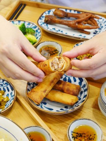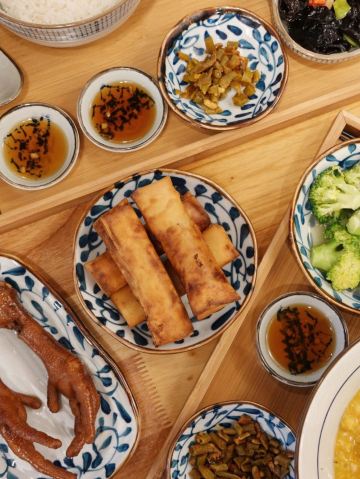 鸡汁蟹粉拌面,蟹粉虾仁面,蟹黄捞饭,蟹粉春卷,白灼西兰花,上汤娃娃菜
