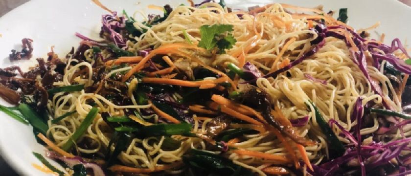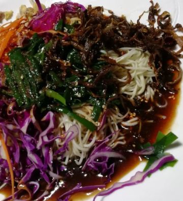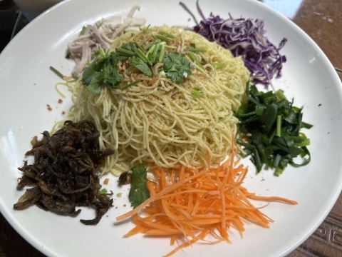 相比,大理的一些餐馆这家菜的菜少了一份精致,但是多了一分量,所以人多的时候性价比还是蛮高的,而且基本上的菜肴也都有。他家的五彩凉面。