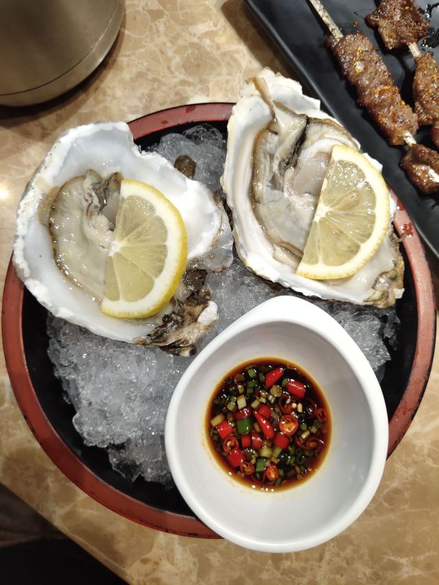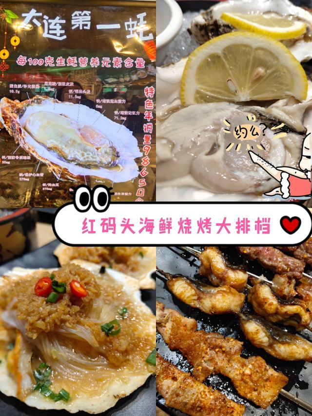 资深肉包子📍『红码头海鲜烧烤大排档』此店好吃,来歹[机智] ⭐实力不容许自己晚上快乐嗨吃,只好中午一个人撸个孤单寂寞但是不冷的串串[1人食][1人食][1人食] ⭐大连第一蚝的招牌高悬,那必须来一份尝尝[奸笑] ⭐想着已经烤蒜蓉粉丝|扇贝^了,|大生蚝^就选了生食[阴险] ⭐巴掌大小的一个蚝的确很豪[强],挤上柠檬🍋汁,一口吸溜下去,肥美!爽! ⭐蒜蓉粉丝烤|扇贝^,獐子岛的夏夷贝也是好大个一个,贝丁切了花刀更加入味[OK] ⭐点的烤串类我都爱啊[爱心],调味和火候比较重,但是我的口味[阴险],|肋条^|牛肉串^|五花肉^全部收入后宫,下次继续翻牌子[阴险],尤其|烤鳗鱼^,没吃过的你一定要尝尝[馋] [服务铃]服务:⭐⭐⭐⭐⭐