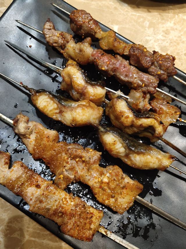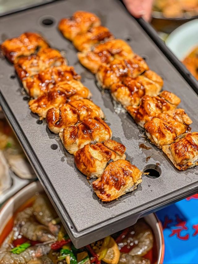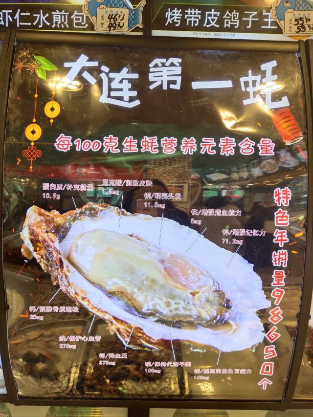 黑蒜烤生蚝,鲍鱼,锅包肉,海胆,大连三鲜焖子,夏夷贝,烤整条活鳗鱼,码头脆海参,一串一只羊,蚬子