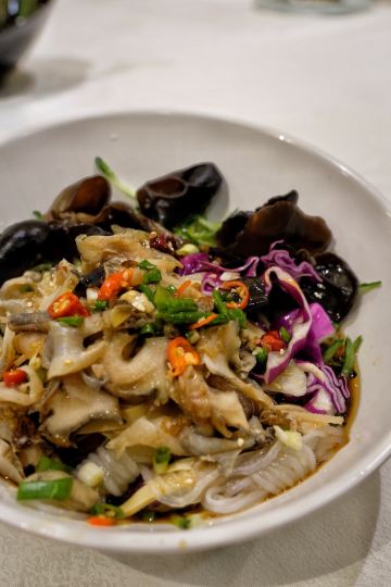 大嘴帮您选饭店下班后没啥事,4个小伙伴一起约个饭。大白菜炒榛蘑放点五花肉,白菜脆甜,很香很下饭。龙虎斗这是典型的大连老菜,很少店能做出来,其实直白点说就是肉丝、笋丝炒蛰皮家店香菜,看起来简单确实一道工夫菜,很考验厨师的功底,同行的小伙伴都很喜欢。石锅长豆角是我自己非常喜欢的,有点干锅的感觉,能很好的突出豆角的味道,搭配五花肉相辅相成,放点辣椒更提味。养生烤山药这个也是我很喜欢的一道菜,就是比较费时间,烤好的山药一头包裹着锡纸方便拿取,配的桂花酱,很是香甜。煎鲅鱼配小饼子,很家常,鲅鱼正是季节,煎的表面金黄里面油脂还丰富,和小饼子一起吃,越吃越香。主食要的是芸豆包子。隆重推荐一下,这个棒鱼刺身,很考验鱼的新鲜度和师傅的刀工,一条棒鱼12元,三条鱼就能做出一大份来。棒鱼刺身肉质紧实,口感弹牙,喜欢的小伙伴一定要试试哦。