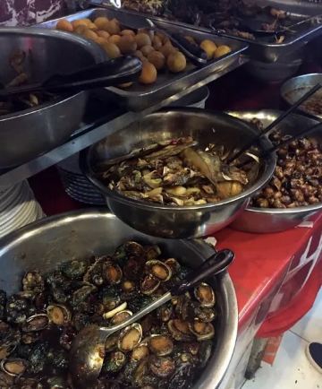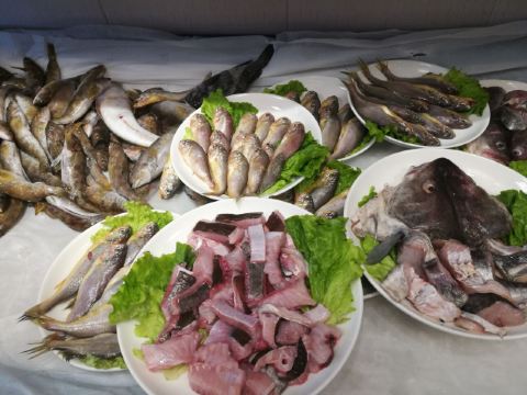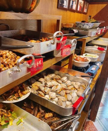 海肠水饺,炸虾仁,酱小鲍鱼,蚬子,杂拌鱼,拌鸟贝,海鲜饺子,海胆,咸鱼饼子,大连鲍鱼,虾酱,黄花鱼丸汤