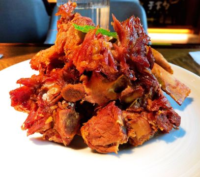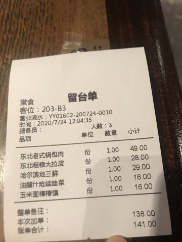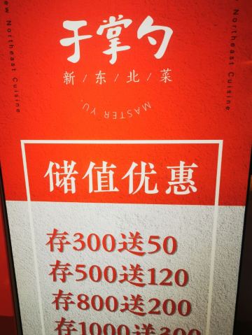 于掌勺在柏威年五楼最边上,餐厅的装修很别致,环境很优雅,前台服务员非常热情,餐厅装修的让人感觉很舒服。我们点了几个特色菜,其中于掌勺特色烤大花卷外面是烤得像面包一样的皮,吃起来和面包差不多,哈尔滨酱薰手撕骨味道很好,还点了一份东北炖菜。尝试了东北菜,也许因为我们是四川人吧,感觉东北菜和川菜比起来各有特色,但是川菜更精致,味道更鲜美,感觉还是川菜好吃!