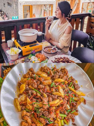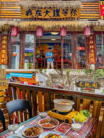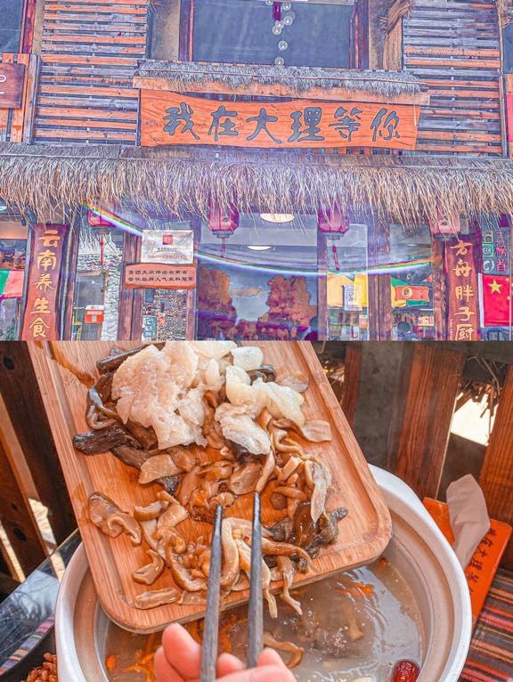 熊 🐻大理打卡 - 来大理感受不一样的美食体验! - 🌸店名:大理方舟胖子•我在大理等你店 🛣地址:人民路下段498号(东玉街与人民路交叉口西南角) - 👀来到云南必不能错过的就是野生菌锅汤,经过多方对比,我选择的是我在大理等你·方舟胖子厨房,在某团和某评的排名都很高,算是实惠又美味,性价比极高! - 👉🏻海店铺的整体装修风格是一种古朴自然的风格,坐在靠窗的位置特别适合拍照📸 - 🎈不光环境好,店员的服务态度也真的没的说! - 🔥他家推出的套餐非常划算又好吃,我们点的是野生菌超值2-3人餐,里面包含了一个放养生态鸡汤锅,三个配菜一份小吃四样野生菌菇以及米饭蘸水等~ - 🔥鸡汤锅配料很丰富,鸡肉、党参、红枣枸杞,上锅底后加入菌菇大火煮开继续煮十几分钟就可以开动了。有着牛肝菌、竹荪菌、黄罗伞菌和虫草花加持的鸡汤