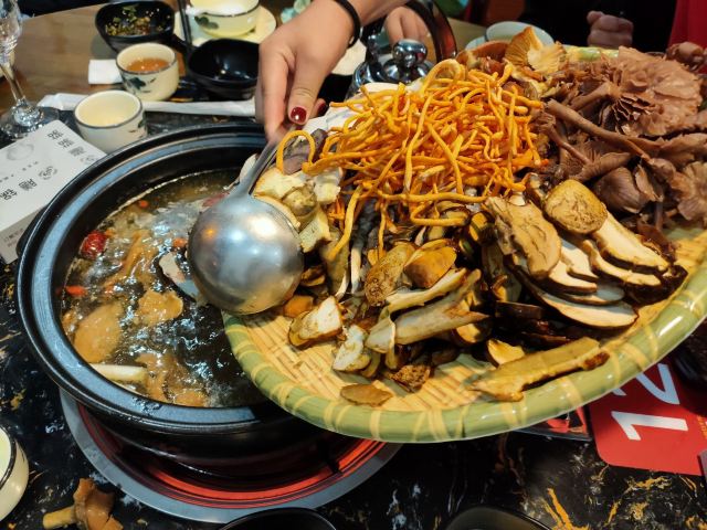 腊排骨,竹荪,干巴菌炒饭,鸡枞,松茸,豌豆尖,野山菌,菌子火锅,鸡汤锅,白葱