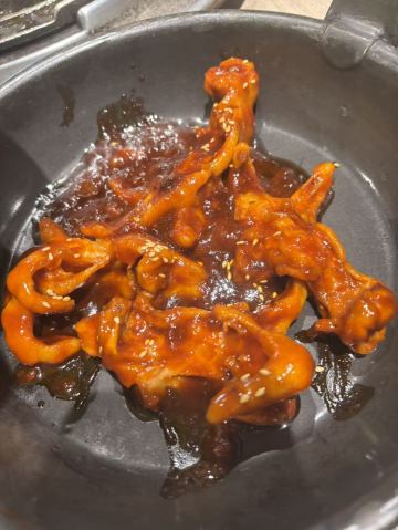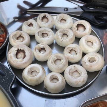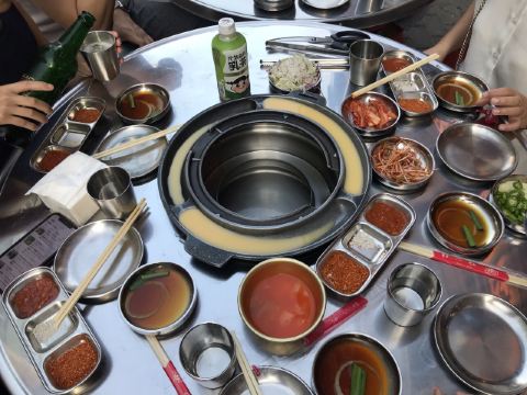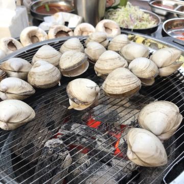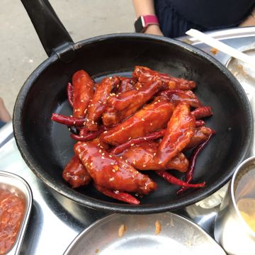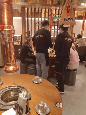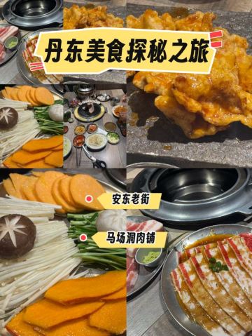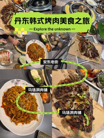 Machangdongroupuhanguoxiaojietanhuo Barbecue丹东除了海鲜,韩国烤肉也是一大特色,正好参观完鸭绿江断桥,搜了搜附近的几家店,最后选择了这里。 从断桥走过来差不多20分钟,我们到的时候里面都坐满了,10个人让拼成2桌,直接坐在上街沿的人行道上,事实证明我们运气不错,到了晚上已经开始排队了。 两桌除了石锅拌饭和朝鲜冷面,其他基本上每桌各点一份,「山蒜叶烤五花肉」一大块五花肉,烤好之后切成条状,很独特的吃法,五花肉切条,卷上山蒜叶,肉香中带着清香。 「烤口蘑」放在鸡蛋糕上直接烤,最后整个蘑菇中间是蘑菇汤,鲜美无比。 「马场洞鸡翅」微辣但是甜甜的,非常吃得惯。鸡翅每块都切的小小的,方便一口一根。 「调味牛肋条」牛肋条很嫩,口味已经事先腌制好了。搭配上送的生菜叶,蘸着韩国大酱,超级满足。 「熟牛舌」非常的厚实,口感酥烂。 「烤白蚬子」没有黄蚬子,没有黄蚬子,只能吃白蚬子了,味道也很美味,只是小了一些。 「石锅拌饭」「荞麦冷面」「海鲜饼」「金枪鱼紫菜手抓饭」都很推荐,成年人不做选择题,我们全都上了,金枪鱼饭团超级推荐,好吃😋 鸭绿江啤酒🍻味道比较淡,度数不高,吃烧烤的时候适合喝一个。 [薄荷]环境: 店里面氛围不错,韩国烤肉店的氛围浓郁,马路上虽然不同于店里,也是生意火爆。 [服务铃]服务: 没有比较就没有伤害,它们家帮忙烤肉,上菜也比较快,比后面那天吃的长白山烧烤服务好。