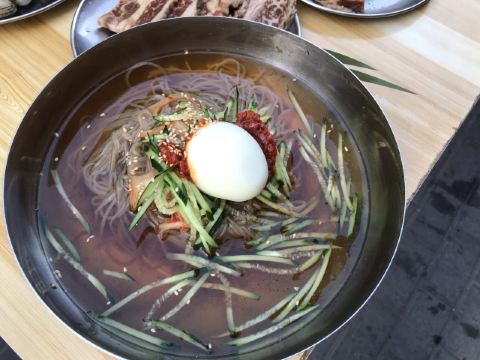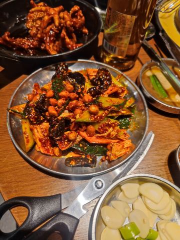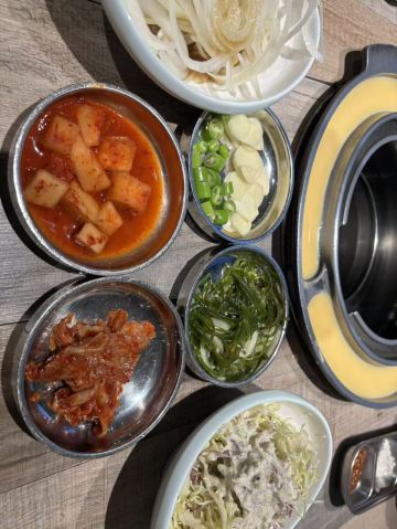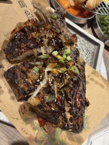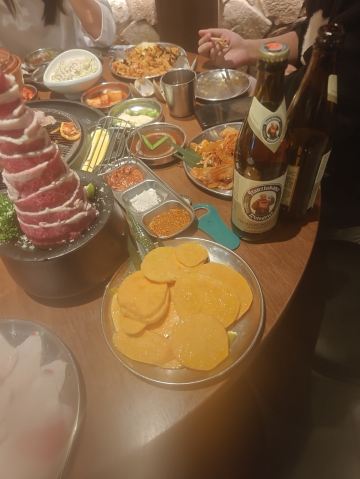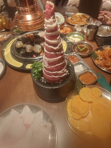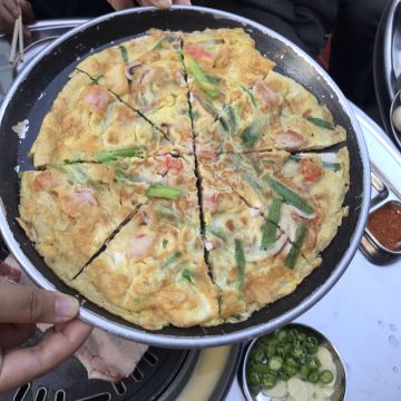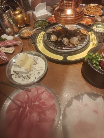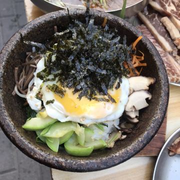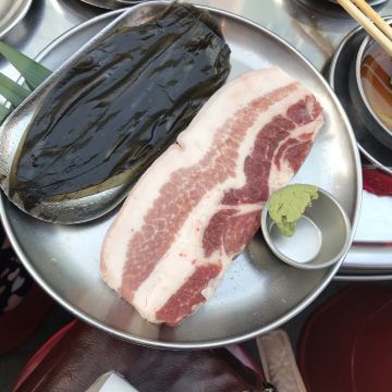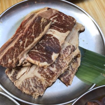 吾是土豆泥丹东除了海鲜,韩国烤肉也是一大特色,正好参观完鸭绿江断桥,搜了搜附近的几家店,最后选择了这里。 从断桥走过来差不多20分钟,我们到的时候里面都坐满了,10个人让拼成2桌,直接坐在上街沿的人行道上,事实证明我们运气不错,到了晚上已经开始排队了。 两桌除了石锅拌饭和朝鲜冷面,其他基本上每桌各点一份,「山蒜叶烤五花肉」一大块五花肉,烤好之后切成条状,很独特的吃法,五花肉切条,卷上山蒜叶,肉香中带着清香。 「烤口蘑」放在鸡蛋糕上直接烤,最后整个蘑菇中间是蘑菇汤,鲜美无比。 「马场洞鸡翅」微辣但是甜甜的,非常吃得惯。鸡翅每块都切的小小的,方便一口一根。 「调味牛肋条」牛肋条很嫩,口味已经事先腌制好了。搭配上送的生菜叶,蘸着韩国大酱,超级满足。 「熟牛舌」非常的厚实,口感酥烂。 「烤白蚬子」没有黄蚬子,没有黄蚬子,只能吃白蚬子了,味道也很美味,只是小了一些。 「石锅拌饭」「荞麦冷面」「海鲜饼」「金枪鱼紫菜手抓饭」都很推荐,成年人不做选择题,我们全都上了,金枪鱼饭团超级推荐,好吃😋 鸭绿江啤酒🍻味道比较淡,度数不高,吃烧烤的时候适合喝一个。 [薄荷]环境: 店里面氛围不错,韩国烤肉店的氛围浓郁,马路上虽然不同于店里,也是生意火爆。 [服务铃]服务: 没有比较就没有伤害,它们家帮忙烤肉,上菜也比较快,比后面那天吃的长白山烧烤服务好。
