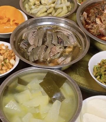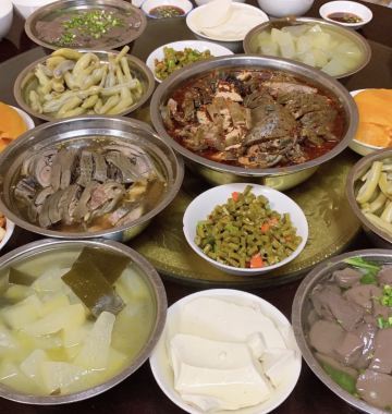 凉拌鸡,血旺,手撕鸡,豆花,耙耙菜,凉拌豆腐干块,冬瓜汤,土公鸡,土豆泥,红油凉粉