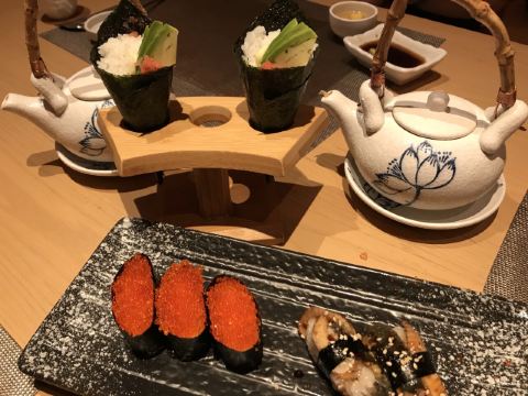 核桃包,酱炒萝卜糕,华南燕液虾饺皇,金瑶鱼茸萝卜糕,鲜虾生肉包,中山芥辣煎饺,鲜竹牛肉丸,黑木耳蒸排骨,甘笋沙黄包,上汤灌汤小笼包,红酒鹅肝,三文鱼,甜虾刺身,海胆刺身,生蚝刺身,刺身拼盘,鲜虾,铁板烧,鳌虾,海鲜茶壶汤,牛肉丸