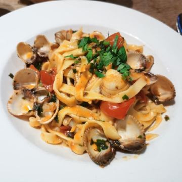卡尔博纳拉奶汁意面,蛤蜊海鲜意面,鸭肉意大利式馄饨,特色意式水饺,烤海鲈鱼,提拉米苏