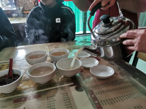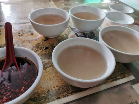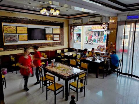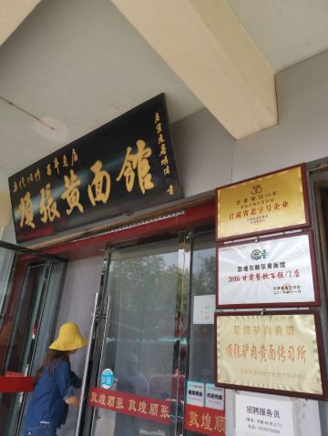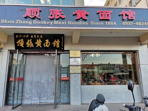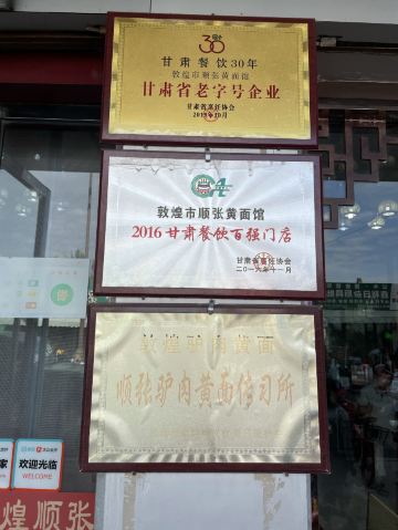 Shun Zhang Donkey Meat Noodle黄面,当地俗称“丢面“,由于在制作过程中加入了戈壁滩上生长的一种碱性植物,使做好的面透亮、筋道、微显黄色,故又称为”黄面“。选用优质面粉,经过和面、揉、撬、甩、拉等多道工序,形状可拉成细、二细、毛细、韭叶、菱形等。 我们两个女生想吃一份黄面,店家服务很好,将一份分成两盘上桌。面汤也十分好喝,冬天来上一碗,暖胃又暖手。店内有专门供观赏拉面的位置,工作人员见我哦在拍还让我更靠近一点。 老字号顺张黄面馆,名字由来是清朝末年一个名叫马官福的黄面馆掌柜,将他的好手艺传给了养子马顺张,于是黄面馆也随之更名为顺张黄面馆了。来敦煌吃黄面,不妨来这家五代相传的百年老店品尝一下,这里的特色是驴肉哦~~另外,一定要试试这家的自制辣酱,不辣,但奇香,蘸驴肉特别美味,单是辣酱我就吃了两碟……