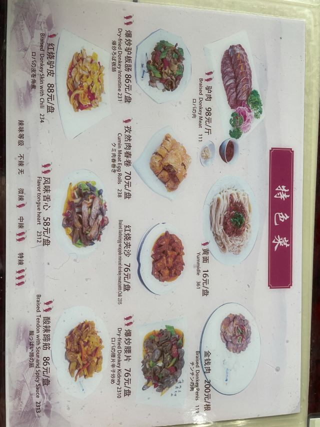 卤驴肉,黄面,杏皮水,酸辣蹄筋,孜然肉春卷,爆炒驴板肠,麻辣驴舌,沙葱炒蛋,红烧驴皮,凉拌沙葱,杏皮茶,驴肉黄面,酱驴肉,驴蹄筋,驴肉春卷,西凉姜啤,西凉果啤,土豆,油麦菜