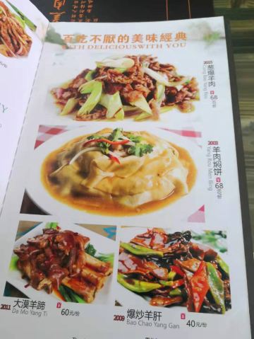 羊肉焖饼,沙葱炒鸡蛋,脆皮茄子,沙漠苜蓿,炒榆钱,孜然羊肉,杏皮水,手抓羊肉,敦煌凉粉,杏皮茶,羊排双拼,胡羊焖饼