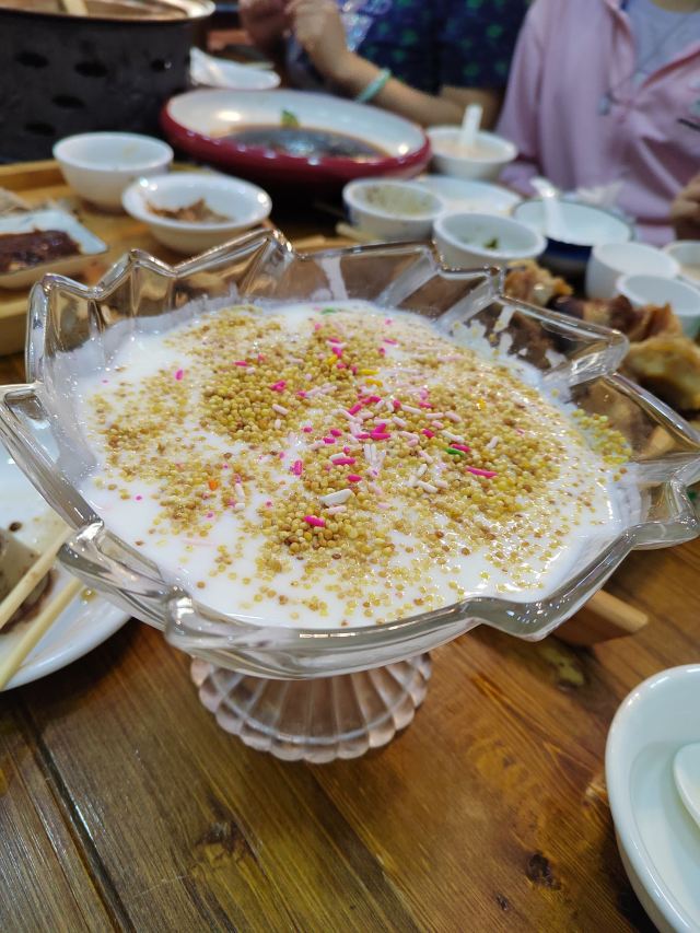 店里装修有边塞特色,窗明几净,可视后橱,边边角角都干干净净,非常放心。店里点菜会根据就餐习惯照顾到,上菜麻利,口味也不错。 推荐锅茶,太好喝了,铜锅现场熬制,奶香四溢,孩子放了些糖,连喝了好几碗。 蒸手把肉,肉嫩而不膻,蘸着小料,让人欲罢不能。 一根血肠上桌,四个人称赞。切的时候要提边切,入口即化,比血豆腐还要软嫩。 酱牛蹄下酒菜首选,有滋有味,Q弹有嚼劲,满满胶原蛋白。 手工酸奶炒米完美融合,清爽开胃,不过糖下下面,记得吃前搅一搅哦。