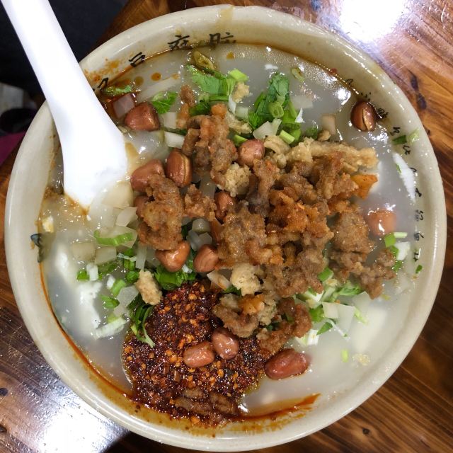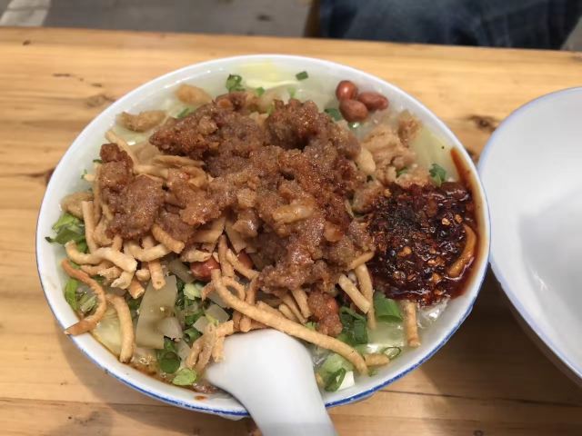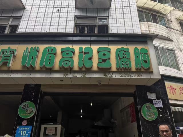 非常接地气的一家店,可谓是峨眉山最有名的豆腐脑店,专注经营豆腐脑和卡饼20年。豆腐脑上面浇了酥肉、牛肉、花生米、大头菜颗颗、葱花、芹菜,很有特色,也非常美味。