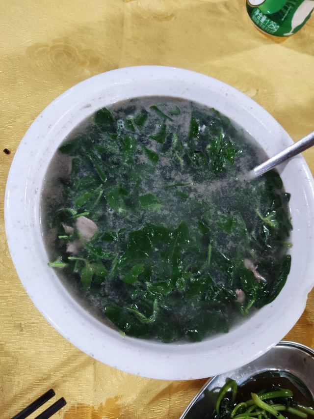 疫情期间出差,到饭点找饭吃,下高速就爆胎了,还好附近就有个修车的,修完车,推荐到这里来吃黄鳝饭。这家店有点农家菜的风格,就点了招牌的黄鳝饭,一个黄鳝骨枸杞叶汤,一只红烧乳鸽,再加一盘炒番薯叶。从菜品的样子看,就是农家风格,不精致,但从味道来讲,都还不错,但是也都偏咸。当然,随便或者路过吃一顿也就这么回事,专门来吃,好像也没必要。