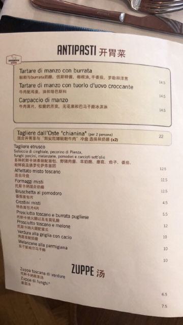 这家牛排餐厅就在火车站对面,是一家主营托斯卡纳菜色的传统意式餐厅。餐厅有中文菜单,晚6点前的牛排套餐非常合算,包含有特色T骨牛排、炸土豆配菜、餐前面包和一杯红酒。此外,也可以单点牛排,与其他家牛排店一样也是按斤计价。