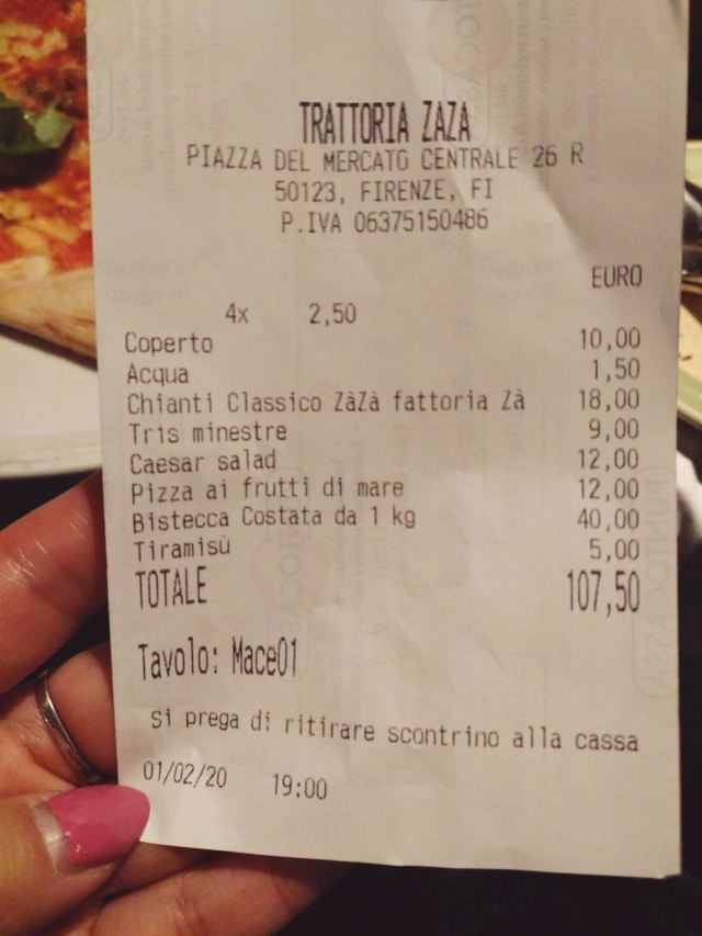 【口味】牛排不差,1公牛38欧的价位着实亲民,两人食绝对够了。沙拉的胡萝卜很脆,配着橄榄油和黑醋相当清口。托斯卡纳特色豆子相当绵软 【环境】在大教堂附近,网红餐厅,人气旺盛。 【服务】服务当真是餐厅的软肋。我们按预订的8时到达餐厅,屋内屋外全部坐满,排位的队伍也有20-30人。如我们这般提前预约餐厅也不会专门留位,只不过优先排队而矣。餐厅内的服务员都是超级忙碌,一路小跑,点餐给账都不够及时这样的就餐环境实是不够悠闲。