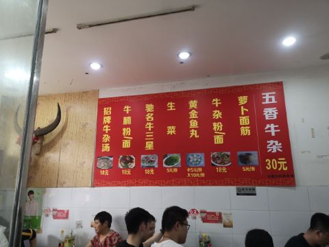 五香牛杂,驰名牛三星,招牌牛杂汤,牛杂粉,牛腩粉,黄金鱼丸,牛大肠,牛腩面,萝卜,牛肚,辣椒酱,牛杂河粉,青菜,牛杂,云吞面,酸萝卜,萝卜牛杂,萝卜丁