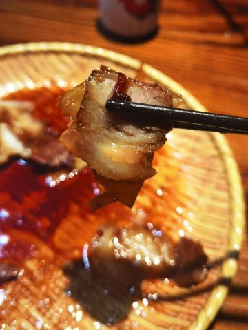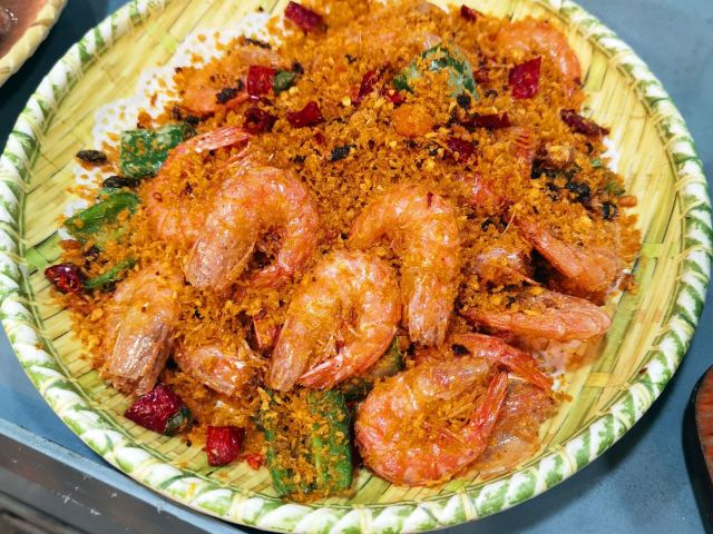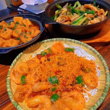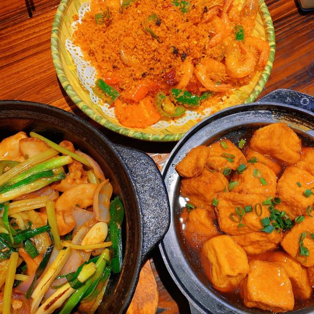 吃的是地道广东菜。粉葛扣叉烧必选,叉烧入口即化,粉葛吸了叉烧油香浓粉糯;金沙咸蛋黄大对虾在咸蛋黄的倒逼中鲜味更浓;烧鹅香脆多汁;田螺芋头粥是主食,是小时候中秋节才有得吃的味道。
