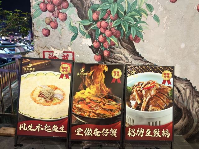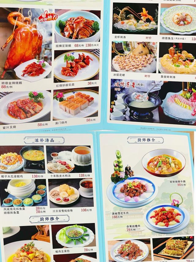 堂做火焰台山奄仔蟹,风生水起捞鱼生,金汤濑尿虾饺,过桥鱼,清炖水鱼,龙飞凤舞,顺德拆鱼羹,蒜蓉蒸生蚝,顺德鱼生,传统中山金吒,藤椒黑蒜牛肋条,特色避风塘炒双宝,无骨鲫鱼,海胆凤眼饺,冰镇花螺,盐焗大海螺,香煎雪花牛肉粒,招牌手撕鸡,凉拌鱼皮,糯米蒸靓鸡,内蒙古奶酪饼,木子姜凤爪,钵仔鲮鱼肠焗蛋,翡翠龍利鱼肠,双皮奶,虫草花鸡汤浸虾饺,拿破仑酥皮,清蒸山水豆腐,黄鳝煲仔饭,筛箕六味鱼,招牌豆豉鹅,水鱼焖鳝鸡,鲜虾烧麦皇,姬松茸猪肚鸡,养生金瓜小米粥,金牌烧鹅,养生黑芝麻包,辽蒸鹅,波士頓龍蝦
