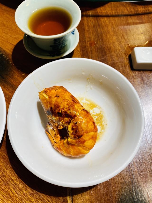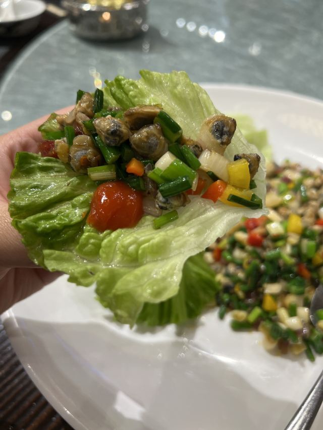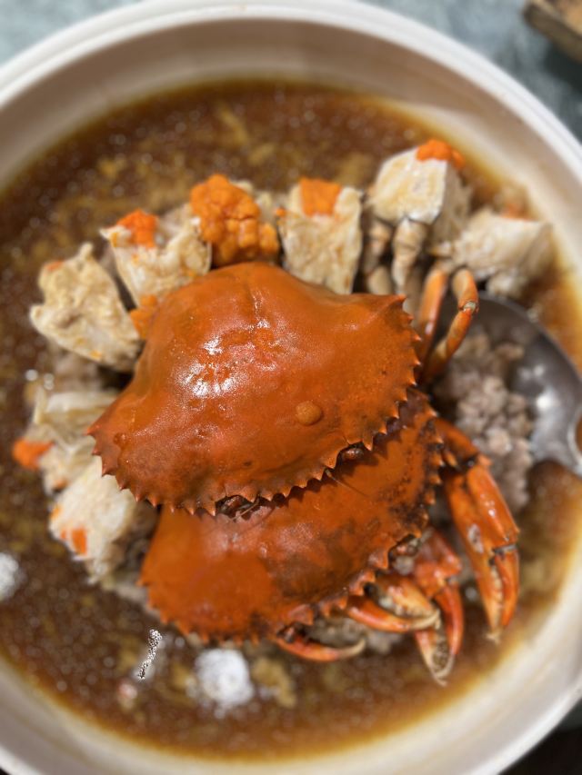 枫行Maple猪肉婆占据了一家古香古色的岭南大院子,一看就是富庶人家的规模。入口处是非常漂亮的食材展示区,几十年的新会陈皮,超靓的烧鹅,一煲一煲的浓汤,还有成排的海味食材,扑面而来的视觉刺激让人目不暇接。 往里走,是极具风味的大厅,小桥流水庭院两侧是一间间房屋,可做包间,可待散客。最里侧还有二楼,可以俯瞰整个院落。 💁服务 我们四个人安排了一个大圆桌,杯子里的普洱一直没有断过。每家顺德餐厅都收茶位费,这家有小帅哥一盯一,倒茶换小碟最为及时。 🍲菜品推荐: ✅[头菜沙虫蒸蚌仔] 延续在湛江吃沙虫的热度,这里的特色是加入了头菜。头菜又被称为“芥辣头”,也是北方的酱菜原料。在顺德人心目中,却有特殊的地位。 头菜被赋予“顺德鲍鱼”的美称,走上餐桌之前,头菜要经历多道工序。端上餐桌的头菜,颜色淡淡的白色,咬一口脆生生。沙虫,蚌仔则是软滑,不同的口感配合,层次丰富。 ✅[罗氏虾] 做法是干煎美极汁。价格不菲,但胜在做法突出了广东特色。