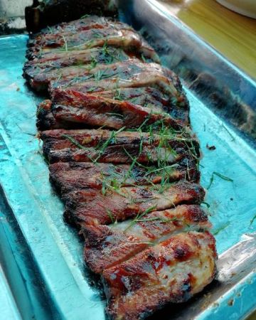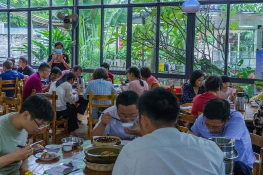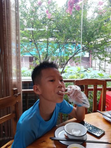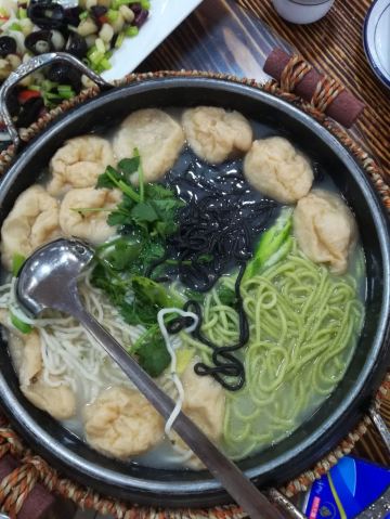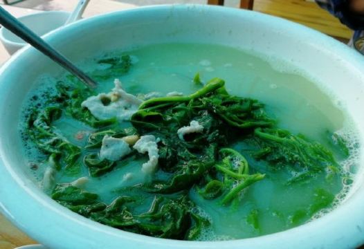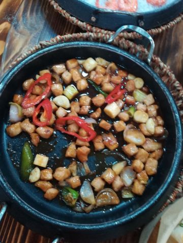 魔女锦鲤朋友开车带我们来这里吃中午饭,来到后觉得好眼熟,之前貌似系叫其它名的,吃竹筒蒸菜的。现在转变成另外一种方式的农家菜。门口的左手边系半开放式厨房,可以睇见厨师忙碌的身影,门口还有几个自传的锅在煮菜。 餐厅内有好多位置,我们选择坐露天位,可以睇倒池塘。朋友点了几个特色菜。 上汤桑叶,第一次吃桑叶,味道还不错,叶都是比较嫩的,汤也很好饮。 凉拌支竹,尼度的支竹都系自制的,可以系厨房见倒还在晾干的新鲜支竹,豆味很香。 烧排骨,很大,直接用手撕来吃,味道有d欠缺,唔多够味。 墨鱼饼,足料,味道不错。 木瓜冻,清甜。 马拉糕,Q弹,味道适中。 这里的价格也比较实惠的。