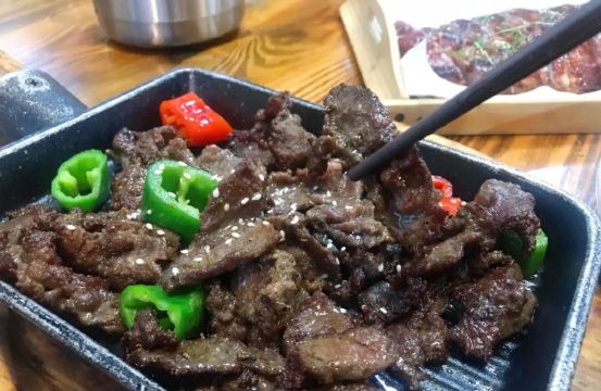 袔樂烧排骨-由香木熏焗浇上蜜糖铺上柠檬草囗感清新,一份足足一斤的量,性价比很高 茄子香芋饼-里面香芋泥超级细滑绵密奶味很足,茄子炸得香脆裹上酸甜酱汁好下饭 不建议打包,凉了之后油都出来了,会腻 铁板牛肉-是招牌推荐,跟炭炉烧烤串的味道相似,孜然香料一撒,香生炒八宝饭-里面有虾米、芋头、腊肉、花生和香葱。最后一样我吃不出来,挺好吃就是有点油腻,上汤桑叶-只要菜嫩基本都好吃,点的菜都比较油腻,用它刮刮油 餐厅很大,有几个厅还有包间,还有机器人送菜,环境不错,重点来了在进门处有二维码 领100-20的餐券,一次可用两张!!!!!折扣下来一顿饭200,人均50