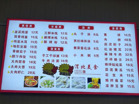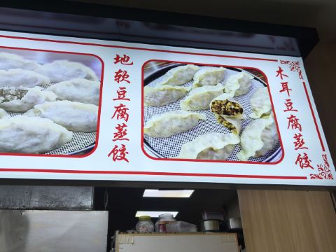 韭菜凉粉蒸饺,西红柿鸡蛋蒸饺,苜蓿孜卷,素拼,大肉葱蒸饺,韭菜鸡蛋蒸饺,萝卜蒸饺,大肉莲菜饺,虾肉蒸饺,南瓜蒸饺,红油耳丝,小豆芽,羊肉蒸饺,羊肉葱罐罐饺子,豆腐丝,紫菜汤