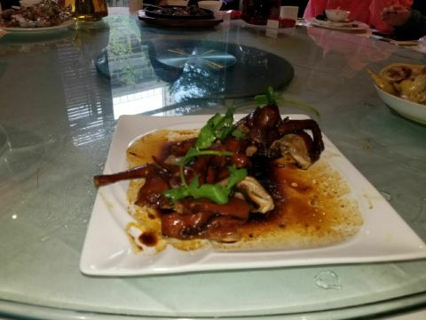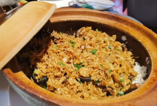 Qiao Mei Shi Jia (Zhu Jiang Xin Cheng)颇有名气的粤菜饭店,店内环境典雅高贵,精致大气,入门便看到各种生猛海鲜,服务贴心周到,有礼貌,用餐环境舒适,但空调不太够,用餐时有点热。 出品方面,①秘制牛肉卤水花生,味道不错,花生软绵入味,但牛肉就不多见了;②秘制脆皮黑叉烧,肥瘦适中,软糯香甜,入口即化,酱汁在口腔与肉香混合,一口一块很满足,但多吃还是会腻;③客家芋荚生焖龙趸,香味四溢,龙趸肉质紧致,金针菜吸收的酱汁爽脆入味,但略略咸了点;④台山黄鳝饭,香味浓郁夺人,酱汁包裹着每粒米饭,粒粒分明不粘口,黄鳝的细腻与米饭的清香简直绝配;⑤红烧乳鸽,外表焦脆,肉质纤维细致,有肉汁,不错; 总体菜品份量足,出品水准稳定,味道上来说不会踩雷,但味道略微偏重手
