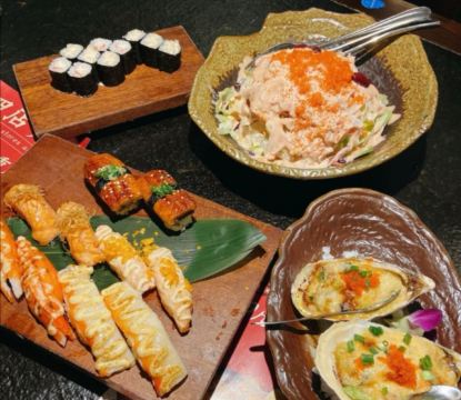 汁烧厚鳗寿司,豪华火炙拼盘,火炙蟹棒寿司,芝士厚鳗寿司,火炙四味蟹棒寿司,超级火炙拼盘,香芒蟹籽沙律,鳗鱼炒饭,鹅肝蟹子炒饭,卜卜脆鹅肝,厚切三文鱼鱼腩,酱脆三文鱼寿司,芝芒焗鳕鱼,火炙鲷鱼刺身