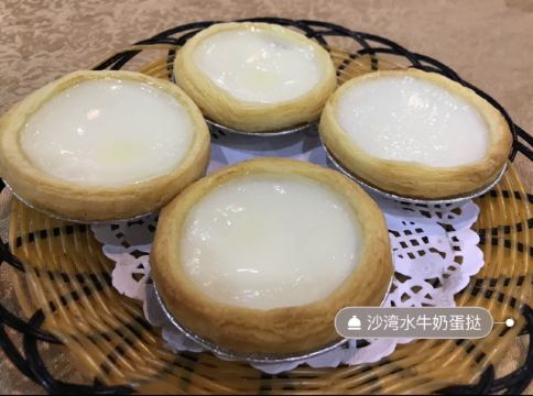 周末过来沙湾玩,中午就在这家餐厅喝茶,中午有早茶直落,一张A4大小的餐纸正反面都印满了点心,选择很多。我们第一次来这里吃东西,正午的时候需要等位,人挺多的,门口有停车位,但是不算很多,就连餐厅外围沿着围墙也都停满了车子,把人行道都塞满了,停车不用收费,有专人指挥停车。一进大门正对着的那一区是功夫茶区,从收银台旁边走进去那一区是普通茶区,我们坐功夫茶区,餐桌椅都是实木的,有点古色古香的味道。茶位收费10元一个茶叶,如果两个人的话,给你一包茶叶,另加一位茶3元,就是等于两个人茶位13元,也可以按每人一包茶叶的价格收费,就是20元。 点心出品不错,姜汁牛肉烧卖,一笼四粒烧卖,好大的一粒,上面堆了一些姜茸,牛肉烧卖很有牛肉味,啖啖肉配上姜味,味道不错。水牛奶蛋挞也很棒,一碟四个,皮很酥,中间的蛋挞馅是用水牛奶做的,所以是白色的,和传统的黄色蛋挞有不一样。最好的一点是,不是很甜,只有淡淡的牛奶香味,对于一些不喜欢吃甜食的人们就最适合不过了。虾饺也可以,里面有挺多的虾仁,虾仁也很新鲜,不过个头就不是很大了,一口塞进一个虾饺,还是蛮不错的。酱香蒸凤爪,我觉得这里的酱挺好好的,凤爪新鲜一些,没有太多的速冻口感,还是新鲜蒸出来的,热乎乎值得一尝。