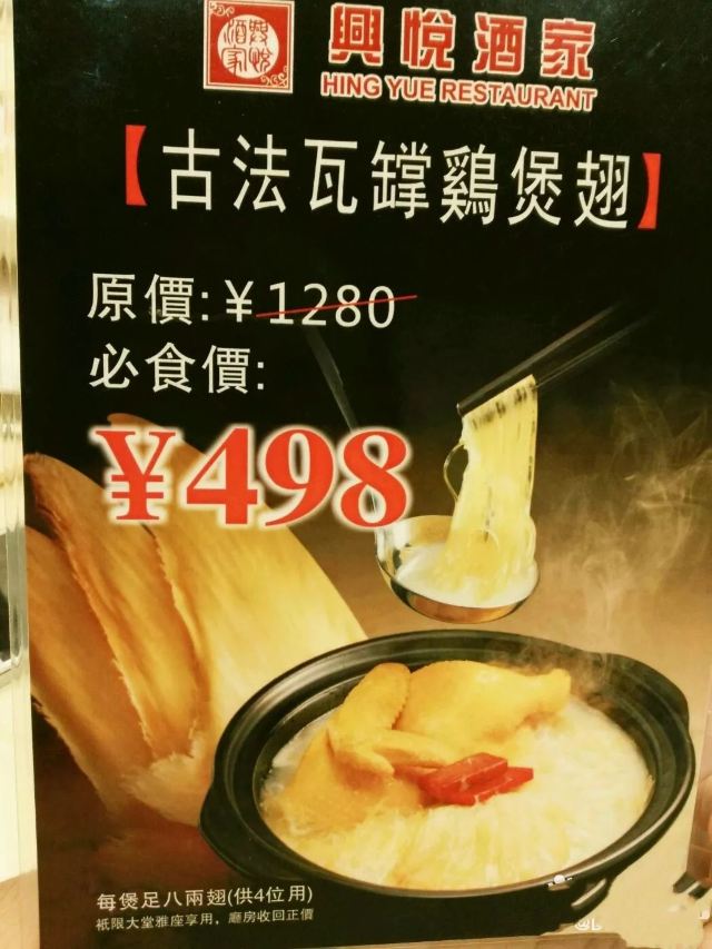 XING YUE JIU GU BAO LI KE LUO WEI DIAN屋企人家庭聚会,选定了来兴悦酒家吃饭。兴悦有两家分店,一间在环市路,一间在天河。天河的店是新开的,而且也方便大家,所以就决定去天河分店,提前电话预订,原本想订房间的,但房间消费不了特价菜品,特价菜品在房间都需要正价收费的。所以为了节省还是订大厅吧。 兴悦的天河分店位置就在保利克洛维二期的四楼,位置很好找,靠近黄埔大道的公交车天河站一下车就能见到(花城汇往中山一立交方向往前走)。必须提醒一下上去餐厅最好是坐观光梯直达4楼,观光梯就在摩天轮对着,小喷泉的后面,LINDA LIVE的隔壁。吐槽一下这部观光梯有点隐蔽,没有明确的指示,如果商场能增加一下指示会比较好。 乘坐观光梯到达4楼就是兴悦餐厅,电梯一出来就看见摆着几个特价菜牌,最为吸引的是鸡煲翅,原价1280元,特价只需498元,不过这个特价仅限大厅使用,房间就要正价收费,好在我们订了大厅就可以享受特价了。另外太子片皮鸭四位以上消费满300元而且预订了就可以18元一只享用,超级便宜喔….. 进入餐厅就觉得这里的装修很气派,走的是高端路线,大厅明亮整洁,坐的位置也很舒适。服务员很快就带位入座,大厅的茶位费8元一位,看了一下菜牌点餐,多款的特色高端粤菜选择,在服务员的介绍推荐下很快就点好菜了。上菜的速度也很快。 首先推荐的是这里出名的,传说中最好吃的叉烧包,新鲜滚热辣上来就即刻品尝,一口咬落去很松软可口,里面的叉烧肥瘦相间,原本我是不吃肥肉的,每次吃叉烧包都会把肥肉挑出来,但这里的叉烧包吃落去并不会感觉肥腻,吃完一个还想继续再吃。 银萝千层酥也是很值得推荐,平时在外面吃的都是榴莲馅料的多,这里的却是萝卜馅料,外酥内软。外皮超级酥化,可以说是我吃过这么多酥最好吃的。 这两个点心都是超级喜欢的,说完点心还是说回菜品吧。荷叶蒸污糟鸡,鸡肉嫩滑,而且吸收了荷叶的香气。 至尊千叶豆腐,这个很考厨师功底的一个菜色,听说还是得过奖的,外型美观,豆腐豆味浓郁而且香滑。 浓汤泡手打鱼腐,鱼腐卜卜,白白滑滑的很可爱,配的汤底也很不错。 今晚的重点菜古法瓦撑鸡煲翅,浓浓的鸡汤底再配上足料的八两翅,汤底香浓,鱼翅爽滑,美容养颜啊。 提前预订位置还额外赠送了甜品,送给我们的是红豆西米糖水,味道也很好喝。 总体菜品味道都很好,价钱有少贵,需要加收10[%]的服务费,但也有很优惠的特价菜色,而且一分钱一分货还是很值得的。