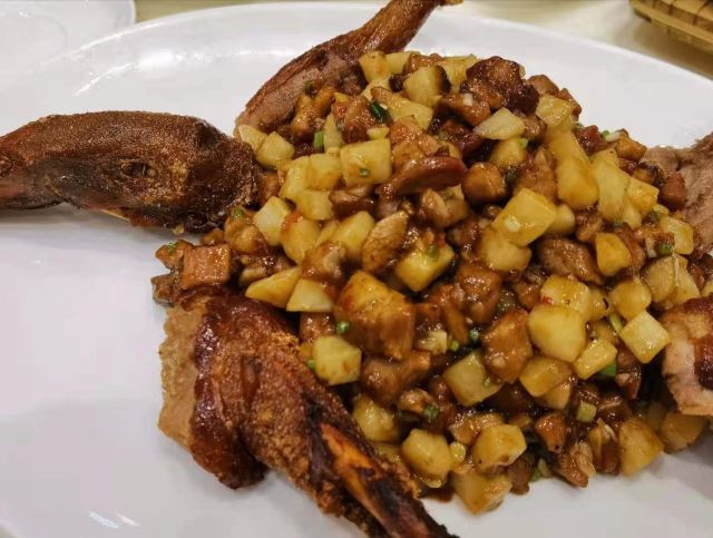 片皮鸭,招牌西施泡饭,鲍鱼汁鸡爪,鸡煲翅,金沙红米肠,冰烧三层肉,叉烧包,点心,山西枣皇糕,一口黑醋果子骨