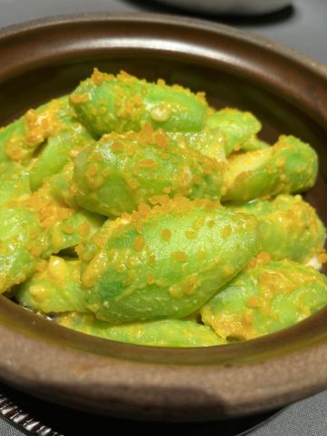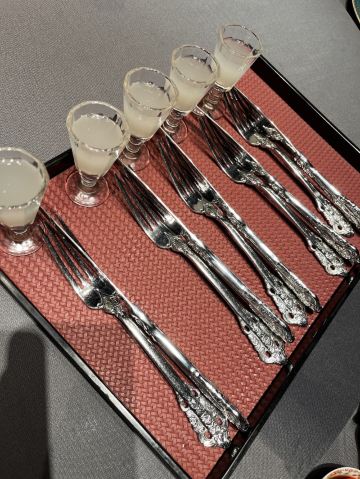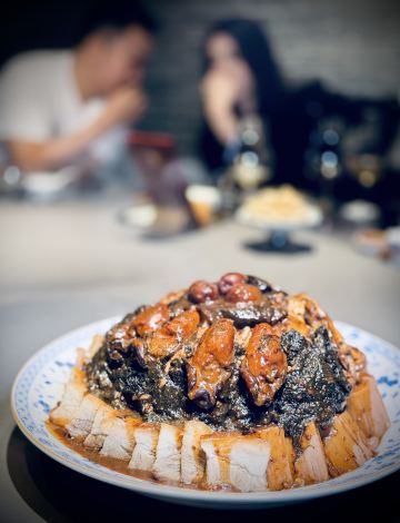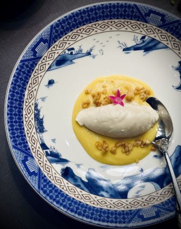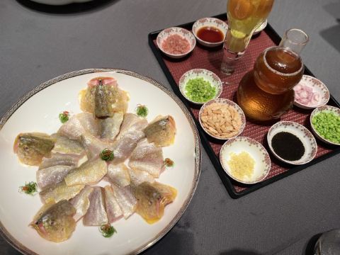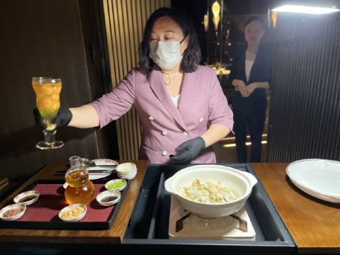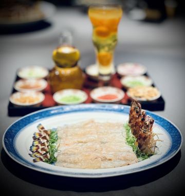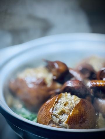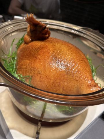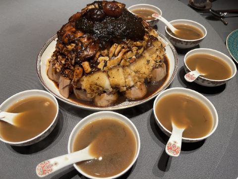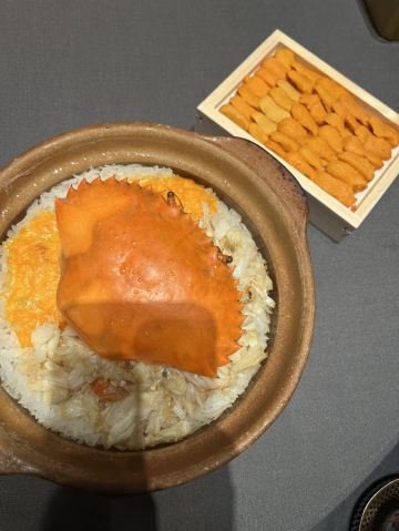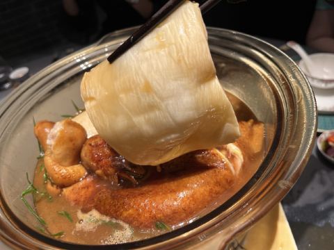 一次十分有趣的晚餐,好多仪式感。 🍃环境:大厅座位不多,以私人包间为主。整个餐厅色调偏暗,聚光餐台,营造了一种私密高端的氛围。 💁服务:餐厅经理关注度高,帅气主厨也有出来招呼。 🍽️菜品:令人印象深刻的几道菜,1️⃣澳门发财蠔市章鱼螺头煲莲藕 一上来就已经惊艳,汤料码得层层叠叠,堆得和小山似的,汤浓郁醇厚,不愧为御膳汤品的名号。2️⃣鸡吞花胶,涨啵啵的油鸡,一剪刀下去,即爆汁喷泉,花胶藏于皮下,滋味相互交融,很独特的做法。3️⃣榄仁黑松露火腿滑蛋炒黄眉头,现场制作,很有气氛,装盘漂亮,鱼是真嫩;鱼头骨椒盐,香脆得很。4️⃣海胆膏蟹煲仔饭 ,橙红的膏蟹和金灿灿的海胆膏先美美地亮个相,再拌匀端上,视觉诱惑味觉享受。 另外,值得一提的特色服务,是☕️茶、碟搭配不同菜式,🍷中间也有两道清新味蕾和解腻的汁水,甚是用心。