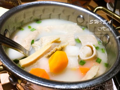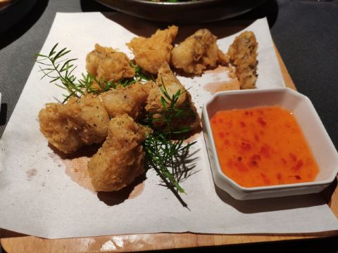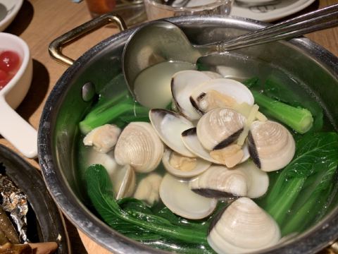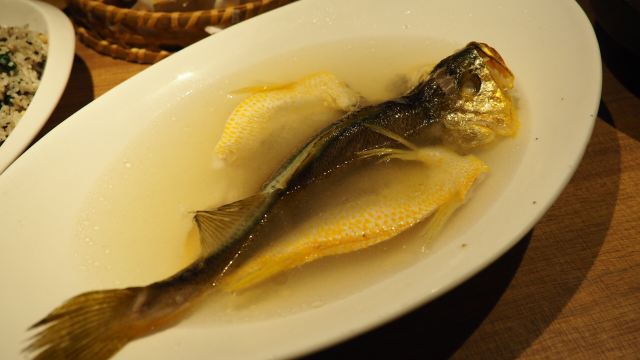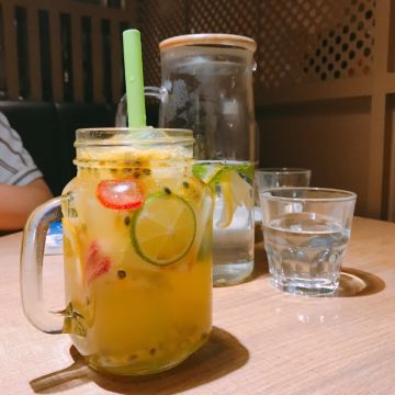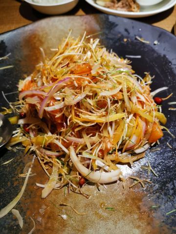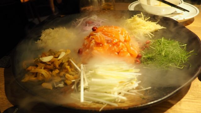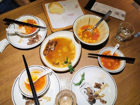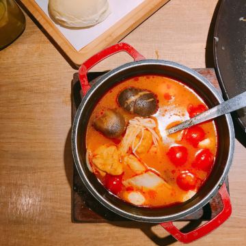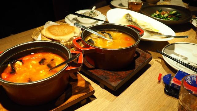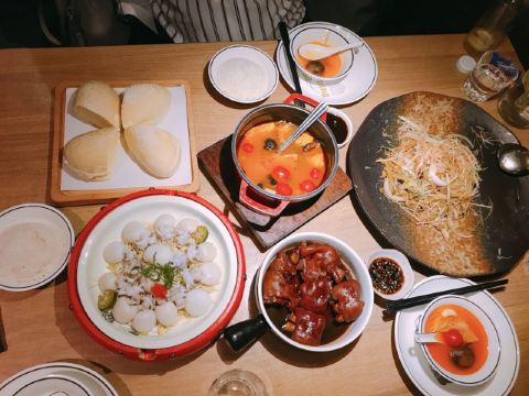 贝奇bobo酱菜式设计很有范,适合新晋探店和朋友们聚会,有网红feel又吃得好~ [位置]天环商城里B2层,超级多人等位,我们4点多来时还是很好进的~ [出品]我们三人点了一个硬菜两个肉菜一道汤和一份面包,份量感觉有点偏多 「捞起三文鱼」刚端上来时还有冒烟...捞完之后的三文鱼会搭配有生洋葱和葱白的味道,介意的亲不建议点~ 「黑金猪手」卤猪手,口感有点腻 「白灼墨鱼仔」这道菜我最爱,很清爽口感很脆,刚好中和猪手的腻 「酸汤海鲜锅」我印象中这是番茄锅来着?味道一般般并没有很出众,广告里还说小番茄是有机还是什么的 「雪山奶露包」真的好吃!这个时候我们已经饱得不行,叫服务员切了几份后打包,大概1小时后再吃也不会变干,馅的流动感还在~ 「柠檬茶」这个中规中矩,当吃饭饮品好啦