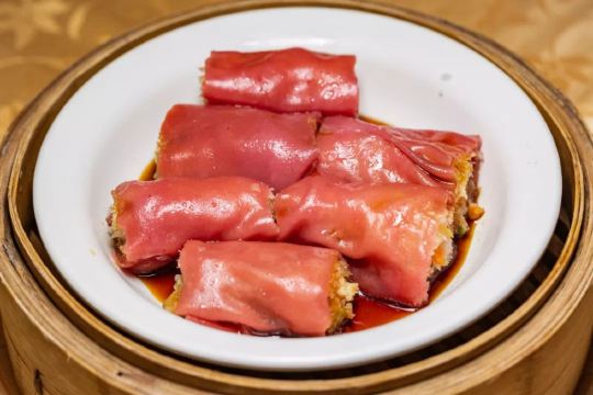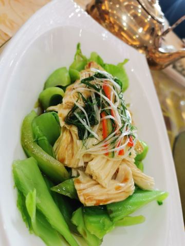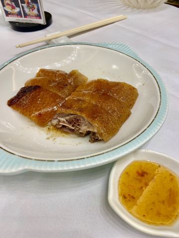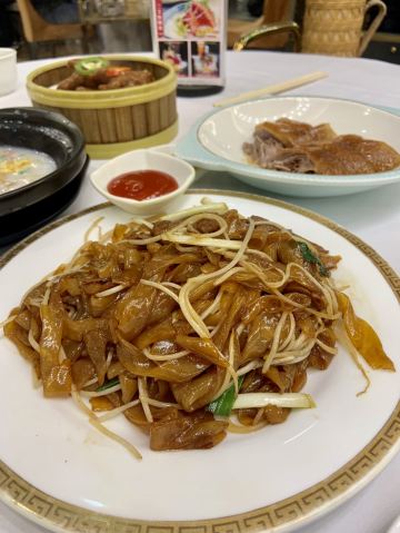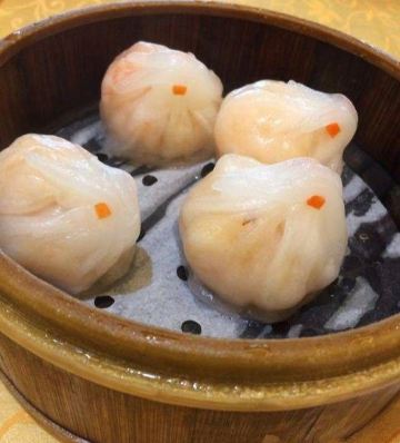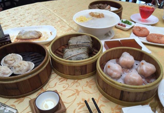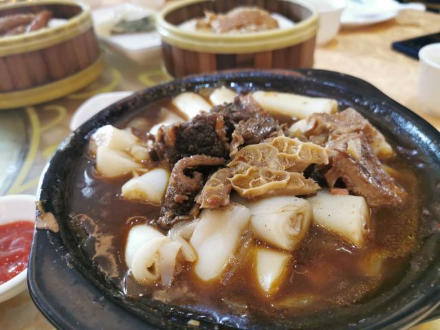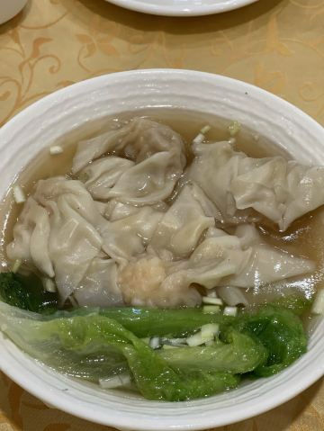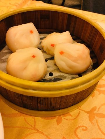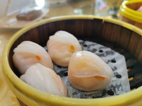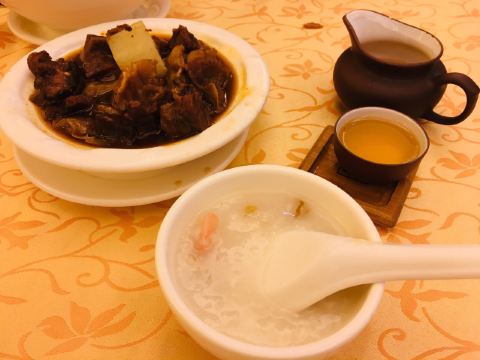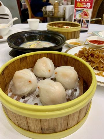 点了烧鹅拼叉烧、荔湾艇仔粥、京葱煲仔饺、沙爹金钱肚、叉烧包还有菊花普洱,每个都很不错,但是最出彩的是京葱煲仔饺,家人都很喜欢吃,很意外又惊艳的口感,和饺子完全不一样,混合了葱香,肉是Q弹Q弹的。