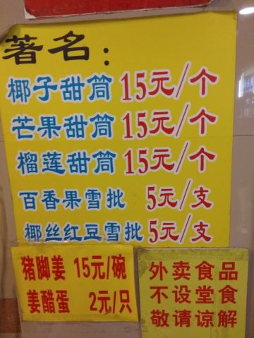 招牌芒果雪糕,招牌椰子雪糕,招牌榴莲雪糕,招牌双皮奶,干炒牛河,拉肠,三色雪糕,鲜虾云吞,红豆双皮奶