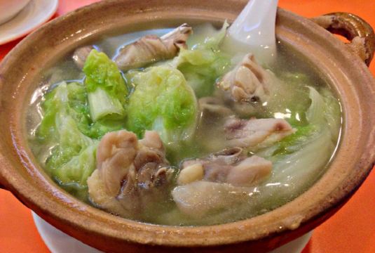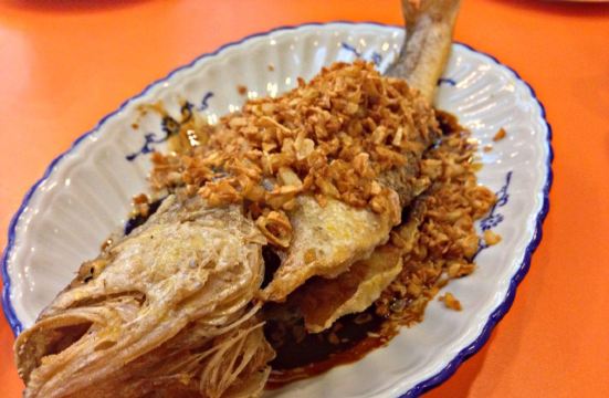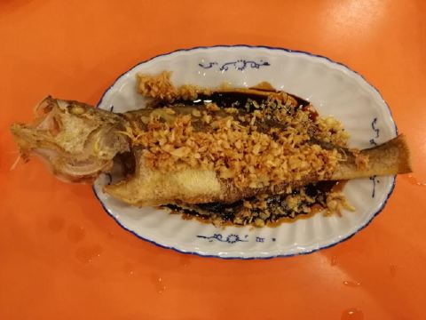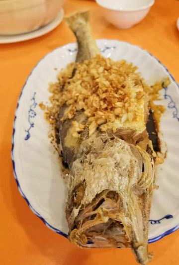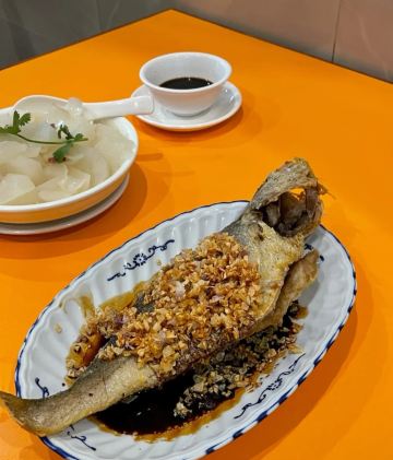 魔女锦鲤传说中隐藏在大街小巷里的富豪饭堂,之前上海朋友来广州吃过,说这里是他暂时心目中排名第一的粤菜,出于好奇,也来试试。店铺就买朝天路上,很好找,中山六路转入朝天路直走就看见倒。店铺有两边,一边是正铺面,再往前走少少也有另外的铺面。环境装修是比较旧式的。 茶位最平8元一位,菜牌的价格也是比其它的餐厅贵,例如上汤蔬菜就需要53元~~~3个人,简单点了几个推荐菜。 黄花鱼,89元,鱼新鲜油炸,变面铺满油炸的蒜蓉粒,虽然是油炸,但鱼肉并不油腻,也保持了鱼肉的嫩白。鱼头,鱼尾,鱼皮都炸得很甘香,最后吃到只剩一条鱼骨。 吃完鱼之后,之后的菜上得无比慢。 等了很久才上饭,要了一煲咸蛋黄饭 43元,很大一煲,足够4人的份量。饭很香,打包第二日吃,更香。 鹅肝酱芥兰 53元,朋友不是太接受这味道,觉得偏猪肝的味道,我觉得还好,不错。 饭后每人送了一碗绿豆沙,糖水的味道也是可以的。 另外这里是不提供蛋糕放冰柜的服务的,如果外带了蛋糕,要尽快吃用~ 这里的味道还是不错的,但价格稍微偏贵,服务也是一般般,上菜速度也比较慢。