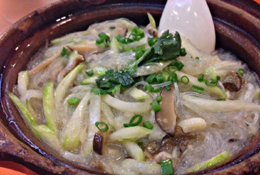 路易十III是日见到微信推送的推介,心郁郁就跟朋友到雅苑拔草。 跟住导航走,于是兜了一个很大的弯,最近应该是公园前I2出口(近动漫星城)。 夜晚这条路真的有点恐怖的说,人丁都没几个…… 虽然不少人调侃这环境跟不上价位,但其实也够干净企理,比某些知名茶餐厅要好。 也不少街坊斩料打包走的。 有二层,不严格来说应该是三层…… 而且这么一个小隐蔽的地方来吃的人也不少。 点菜、收银的貌似只有老板娘了,其他真的就是纯粹打杂的…… 由于很难见上老板娘一面,所以点菜不要七思八想! 【出品】 蠔仔节瓜粉丝煲。跟想象中有点出入,本来想吃干干的粉丝煲,但这一道刚刚相反,小清新。虽然朋友一直吐槽那蠔仔的size,但清清淡淡的其实也不错。而且份量很大! 豉油糖黄花鱼。招牌菜。重口味的绝对不能错过那一大坨炸蒜片,后来朋友直接拿来拌粉丝了……豉油偏稠,黄花鱼外表炸得很酥脆,肉质很嫩,觉得肉少的只有我一个么,因为好像不一会那鱼就只剩骨头了…… 鸡汤大白菜。这个货不对版,完全不是鸡汤,是鸡肉大白菜,哈哈哈。而且还不是那些时常遭人抛弃的部位。大白菜够软淋了,但鸡肉感觉腌咸了点,咸死宝宝了。然后汤也跟着变咸了……而且鸡肉有点小粗鞋。 价位真的不低哇,普通一个青菜类都49以上,肉类更是6,70,但还是不少人帮衬。 对那黄花鱼念念不忘,期待下次再会……